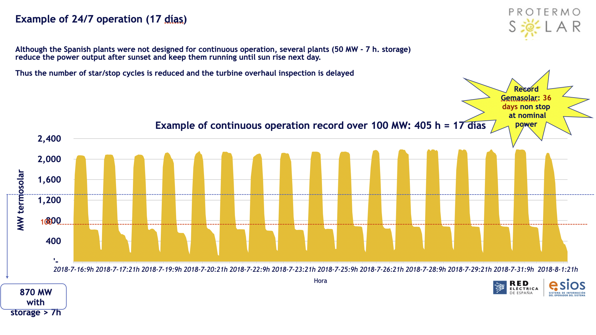 SENER业务经理Sergio Relloso在一封电子邮件中指出:上图记录了Gemasolar光热电站17天全天候的连续运行情况,此外,Gemasolar还保存了连续36天全天候运行记录。