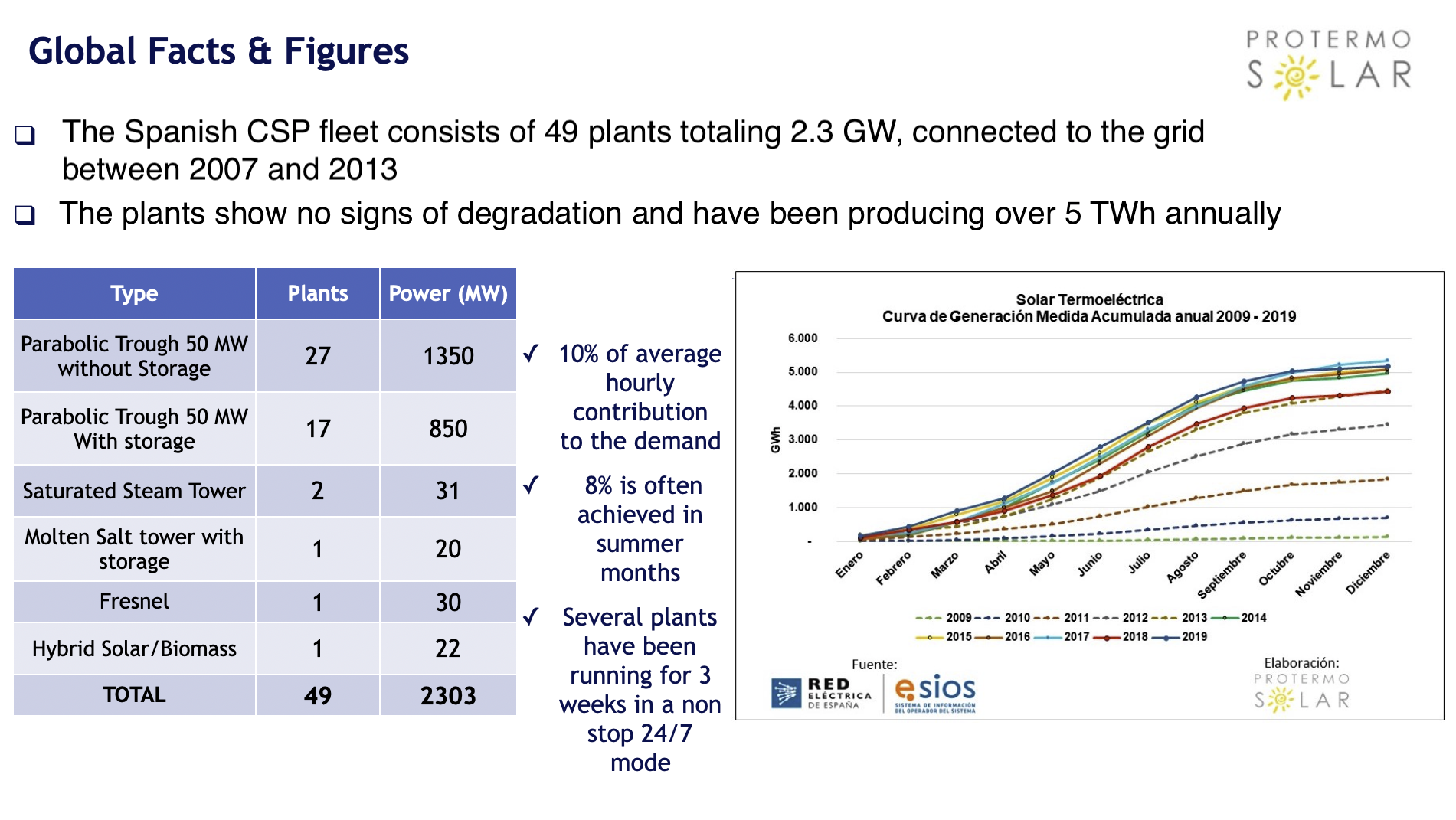 西班牙大约有三分之一的光热电站配置了储能系统,这增加了整个机组的运营时间,因为储能增加了黄昏后和破晓前的潜在运行时间。