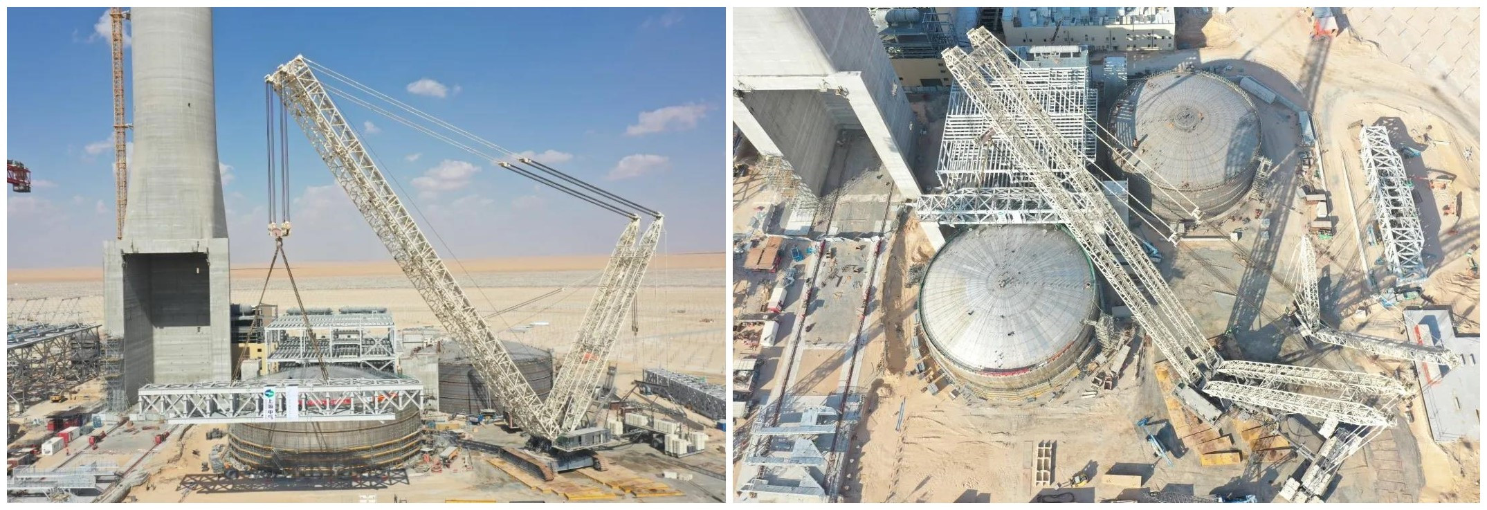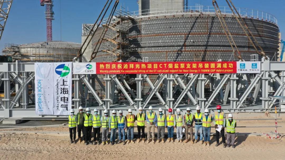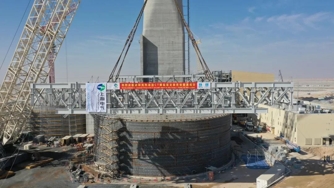 当地时间12月19日,迪拜700MW光热和250MW光伏太阳能电站项目塔式光热发电机组(下文简称:CT机组)熔盐冷泵支架钢结构在耗时2小时后,顺利完成吊装工作。此前,机组的热熔盐泵支架已于12月11日吊装就位。至此,CT机组的冷熔盐泵支架和热熔盐泵支架两组大型钢结构整体吊装已全部就位,为后续熔盐泵安装和化盐工作奠定了基础。