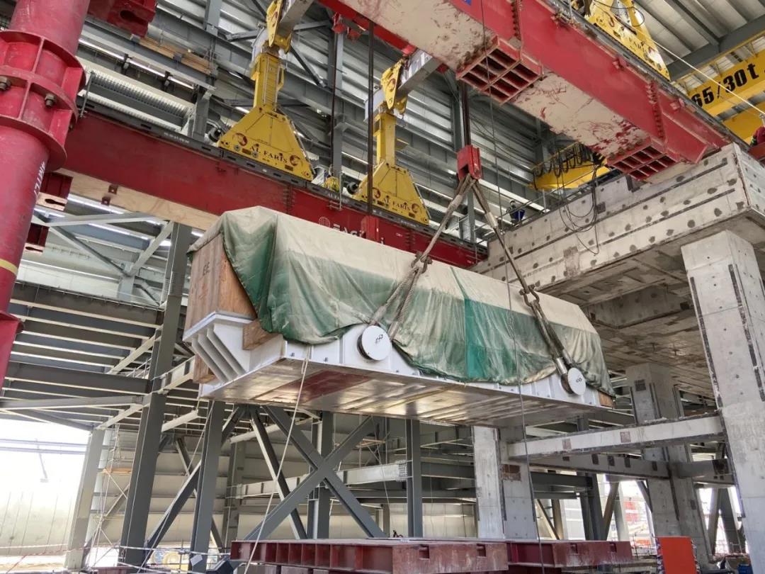 据了解,槽式光热1号机组发电机定子净重超210吨,由于定子超大超重,吊装前,起重技术人员仔细检查钢索张紧度和锚爪咬合等情况,保证每根钢索都受力均匀,并进行了30分钟的悬停试验。经过项目部严格检查、监督和管控,定子起吊、提升及就位等动作一气呵成,吊装工作圆满完成。