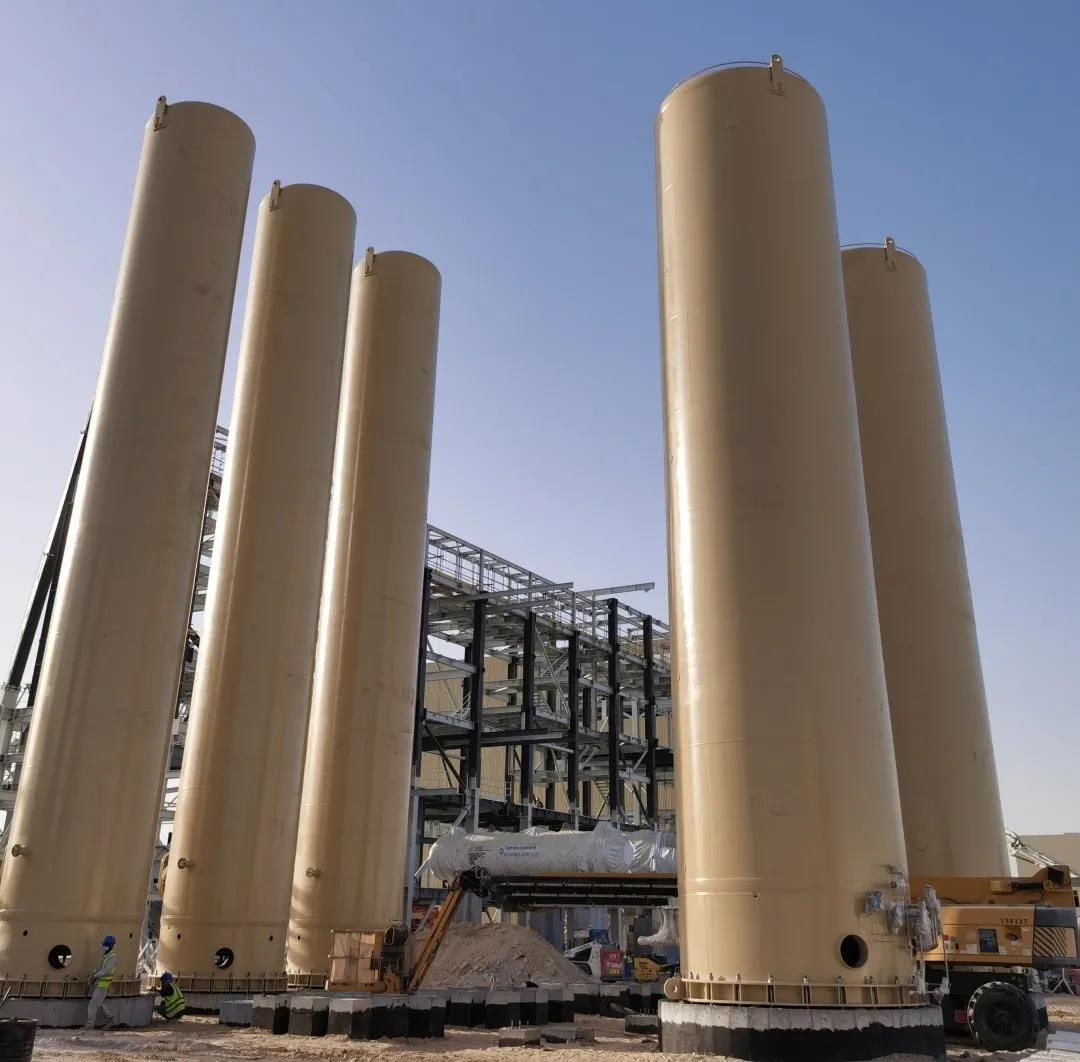 上海电气电站工程公司发布消息称,当地时间3月28日,迪拜950MW光伏光热发电项目最后一台液氮罐吊装就位,标志着槽式一号机组重型设备安装取得阶段性胜利,该厂区所有大型箱罐已吊装就位。