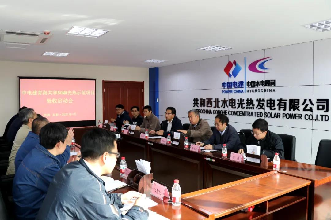 本次验收工作由共和西北水电光热发电有限公司与总承包部共同组织,青海省能源局陈永平、水利水电规划设计总院新能源部太阳能处副处长王昊轶、中南院机务室主任曾勇及西安交通大学教授魏进家等专家组成验收组进行验收,共和西北水电光热发电公司总经理陈登平、西北院生产管理部相关负责人及总承包部相关负责人参加。