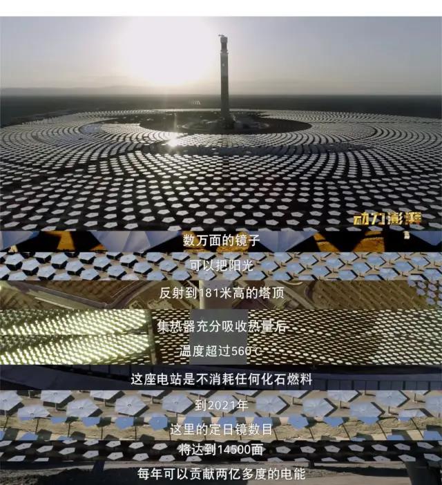 到2021年,这里的定日镜数目将达到14500面,它们追随着太阳转动,每年可以贡献两亿多度的清洁电能。