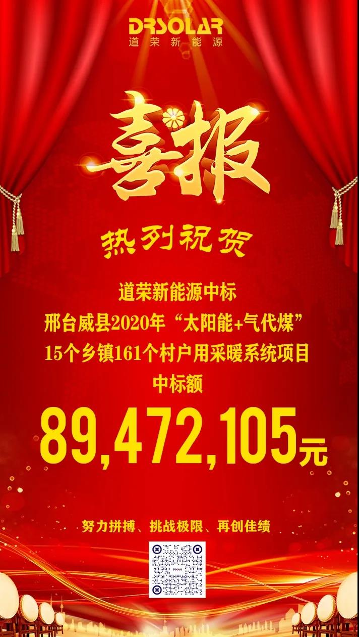 6月7日,河北招标投标公共服务平台发布“威县2020年‘太阳能+气代煤’贺营镇、贺钊镇等15个乡镇161个村户用采暖系统项目(第一标段~第三标段)中标结果公示”。公示显示,太阳能光热联盟理事单位——河北道荣新能源科技有限公司中标其中第一、第二标段项目,总计12099户,中标金额达8947.2万余元,中标的单户报价为7395元/套。