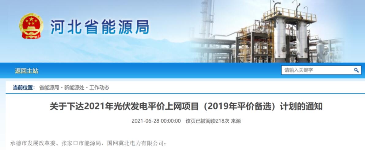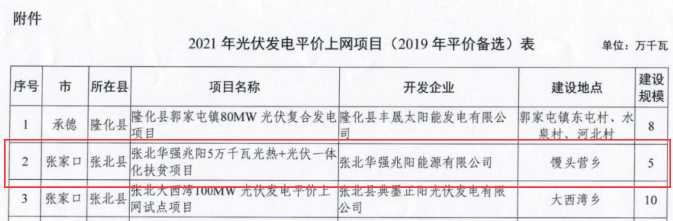 6月28日,河北省发改委下达2021年光伏发电平价上网项目(2019年平价备选)计划的通知(冀发改能源〔2021〕864号)。本次下达光伏发电平价上网项目17个、187万千瓦。其中,由张北华强兆阳能源有限公司开发的张北华强兆阳5万千瓦光热+光伏一体化扶贫项目列入计划名单。
