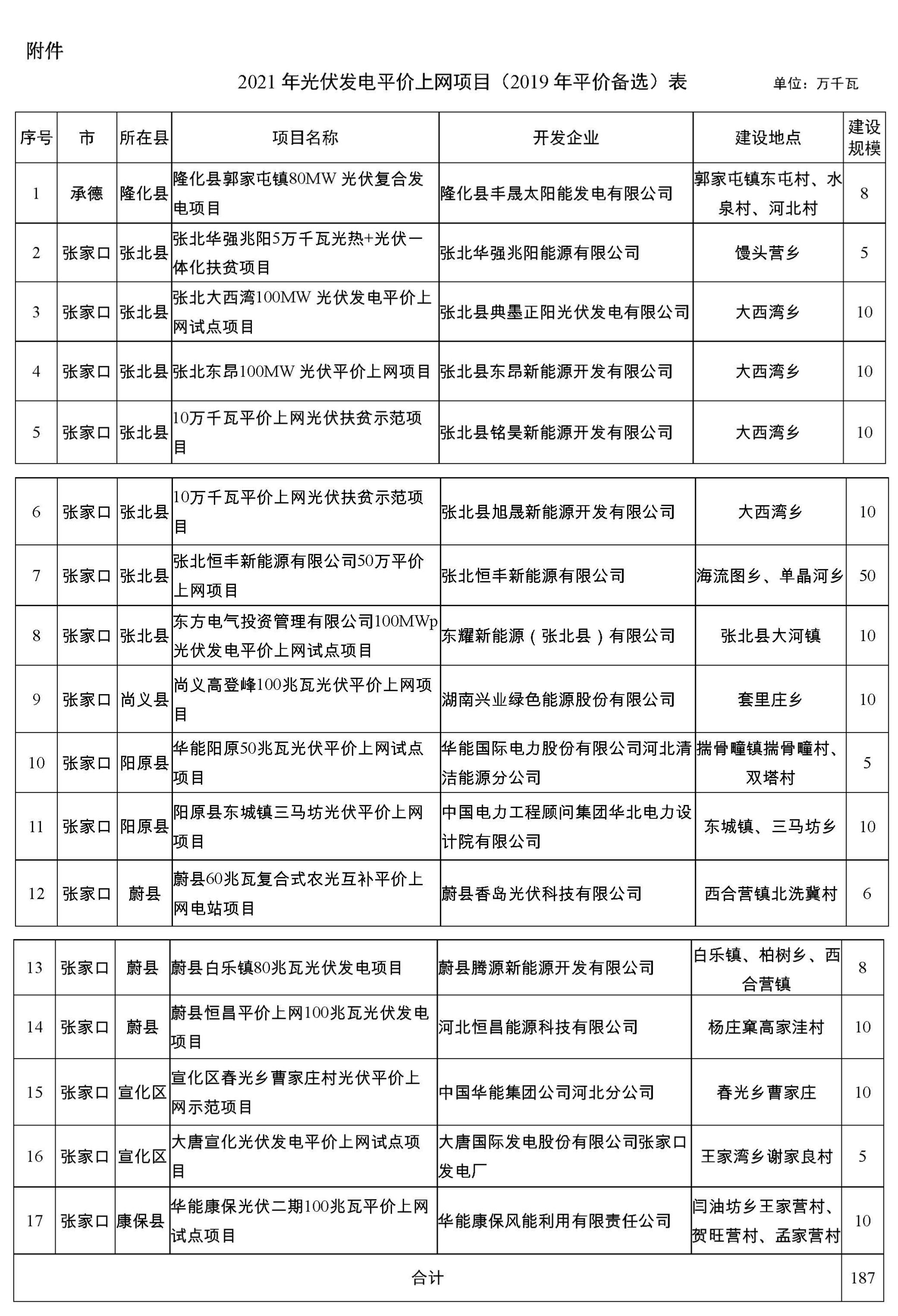一、本次下达光伏发电平价上网项目17个、187万千瓦。具体项目名单见附件。