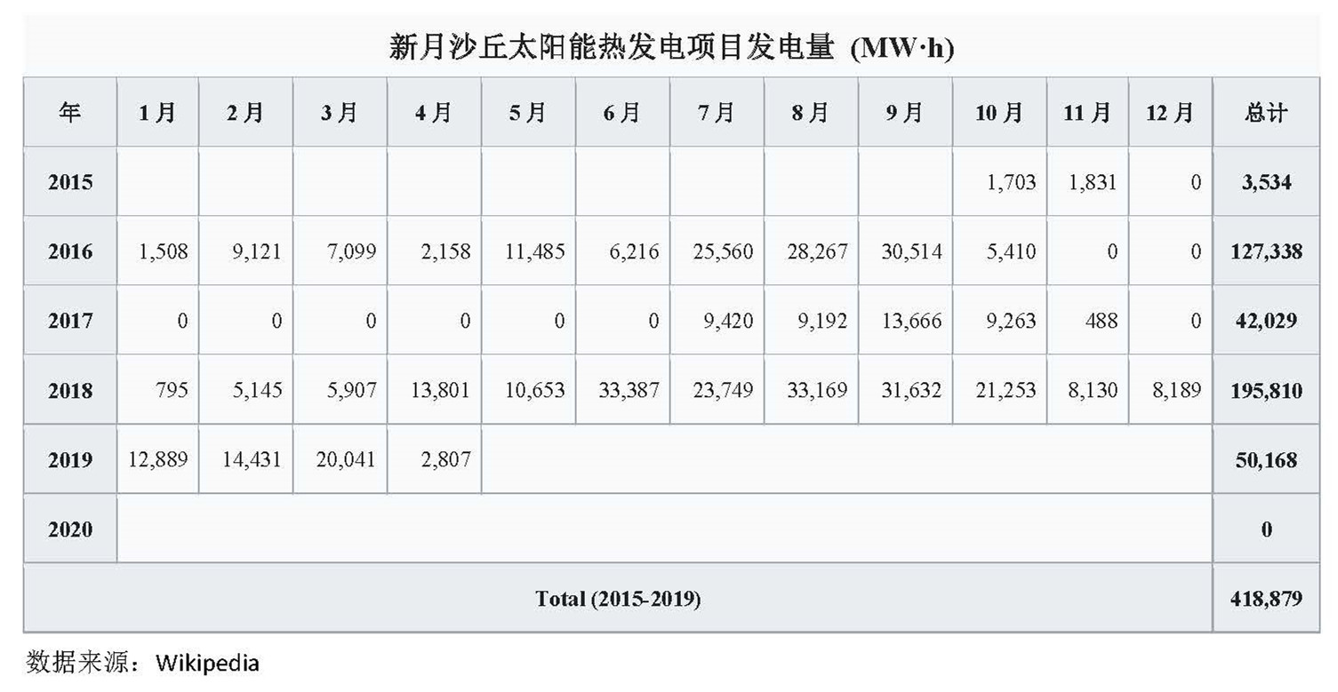 2017年,电站停产8个月后恢复运营,当年度实现发电量42,029MWh。2018年,电站总发电量195,810MWh。2019年4月,因更多热盐罐问题的出现,电站最后一次发电,2019年1-4月份发电量为50,168MWh。