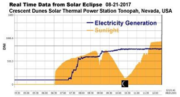 例如,2015年3月20日,德国发生局部日食,经统计在日食现象中,太阳被遮挡了66%~83%(因地区而不同),这对于当时拥有140万座光伏发电系统的德国电网来说是一个巨大挑战。当时有企业对由日食现象引起的极端波动进行了预测:在45分钟内,光伏系统的输出功率由于辐照的变化从13GW降至5GW,并在随后的45分钟内又快速攀至20GW,这等同于8座核电站在最短时间内将所发电能馈入电网,这么极端的快速波动对于电网是极大的挑战。美国当地时间2017年8月21日11时,百年一遇的日全食横跨美国。这对于太阳能发电企业和电网来说,面临的挑战非凡。然而,在这次自然奇观中,得益于熔盐储热,装机110MW的新月沙丘光热电站出力平稳。下图是新月沙丘塔式光热电站在日食出现当天的出力表现:蓝色曲线为电力输出,橙色为阳光。在8月21日上午10:30左右,日食出现,太阳光输入瞬时跌入低谷,但光热电站的电力输出仍保持平滑状态,并没有出现骤然波动,这凸显了储热对于太阳能热发电站及电网的价值。