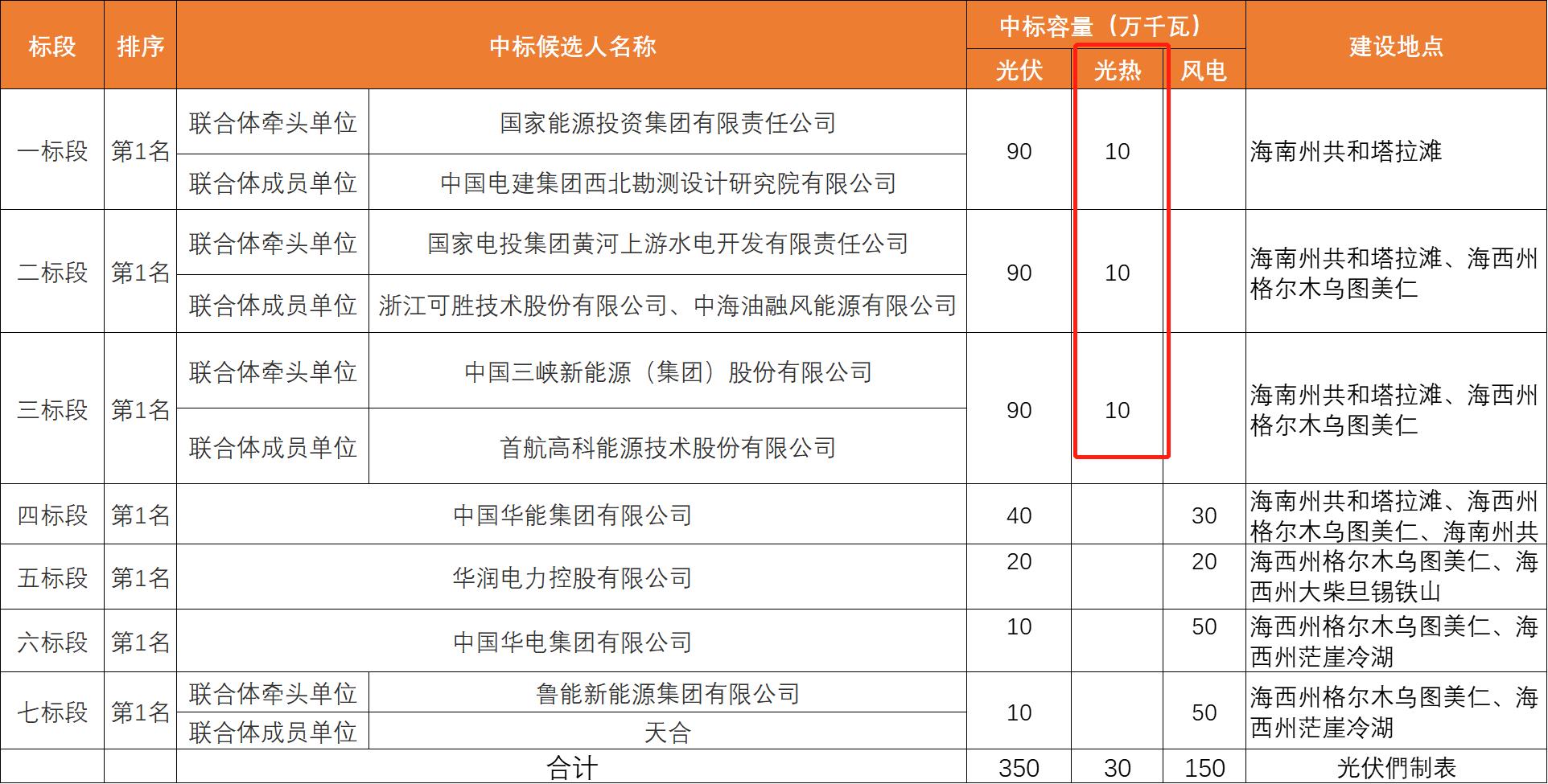 本次招标共划分7个标段,国家能源投资集团有限责任公司(牵头)、 中国电建集团西北勘测设计研究院有限公司 中标第一标段;国家电投集团黄河上游水电开发有限责任公司(牵头)、 浙江可胜技术股份有限公司 、中海油融风能源有限公司中标第二标段;中国三峡新能源(集团)股份有限公司(牵头)、 首航高科能源技术股份有限公司 中标第三标段;中国华能集团有限公司、华润电力控股有限公司、中国华电集团有限公司分别中标四、五、六标段;鲁能新能源集团有限公司(牵头)、天合光能股份有限公司中标第七标段。具体中标结果见下: