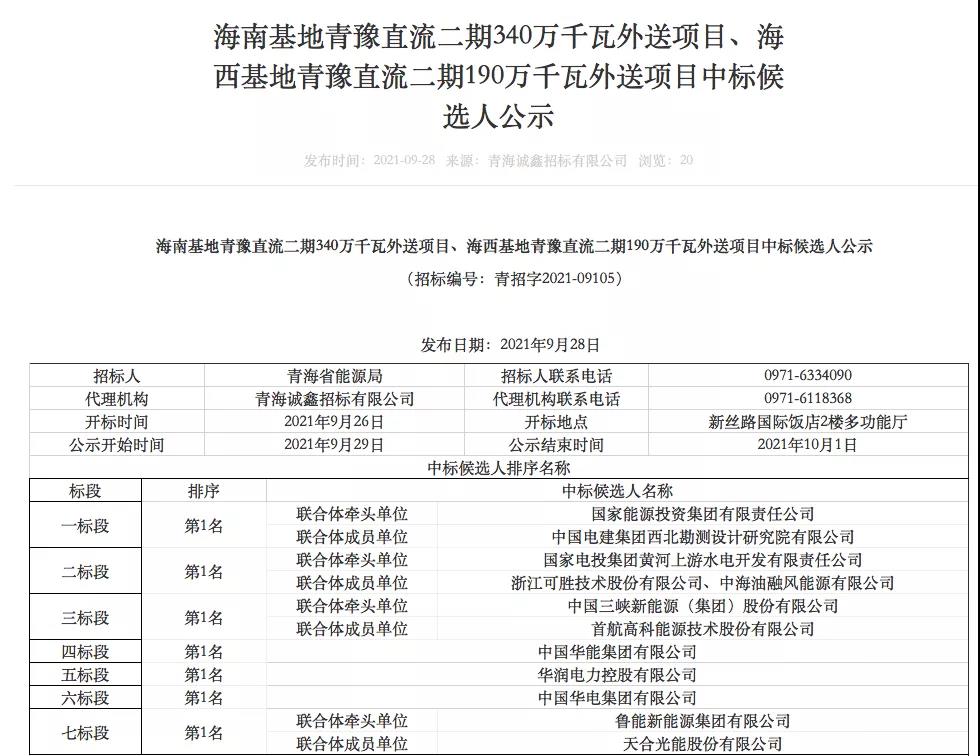 9月28日,海南基地青豫直流二期340万千瓦外送项目、海西基地青豫直流二期190万千瓦外送项目进行了中标候选人公示。其中,光伏项目规模3.5GW,风电项目规模1.5GW, 光热发电项目规模300MW。