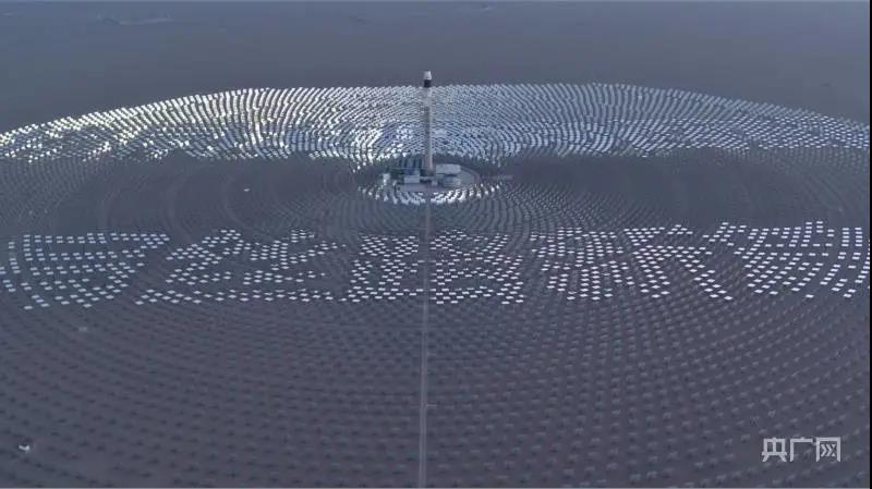 图片首航100MW熔盐塔式光热发电项目利用定日镜打出“协同发展向西望续写丝路新篇章”字样(央广网发 陈沛辰 摄)