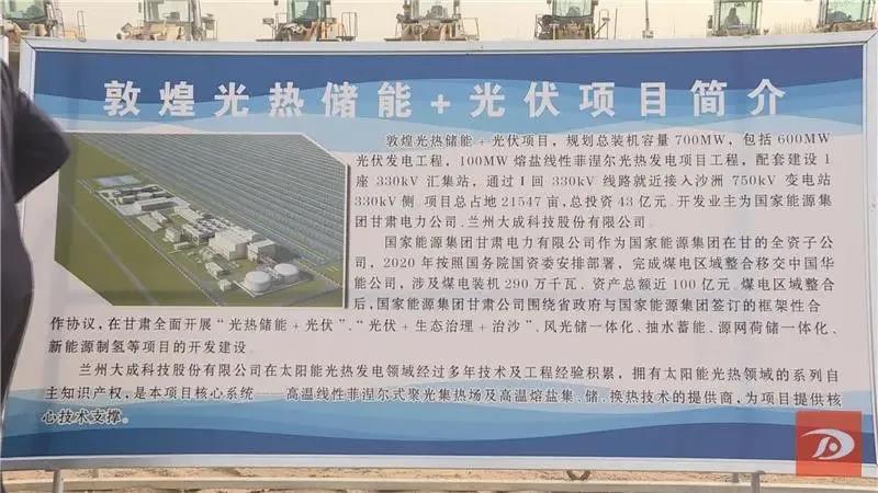 其中敦煌光热储能+光伏项目规划总装机容量700MW,包括600MW光伏发电工程、100MW熔盐线性菲涅尔光热发电项目工程,配套建设一座330KV汇集站,通过1回330KV线路就近接入沙洲750KV变电站330KV侧,项目总占地21547亩,总投资43亿元,开发业主为国家能源集团甘肃电力公司和兰州大成科技股份有限公司。