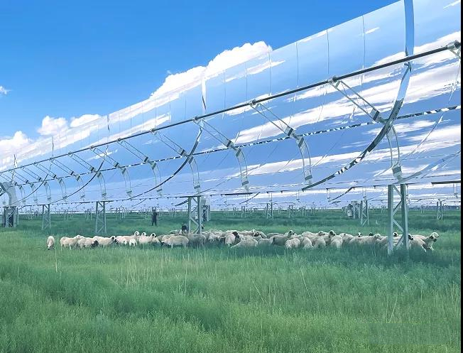 记者在乌拉特项目区看到,一排排整洁的槽式集热回路光热板在阳光下熠熠生辉,并将7300亩荒漠化土地划成一块块整齐的生态区域。在光热板下、板间种植优良耐旱牧草及中草药,并集约化养殖绵羊等,是乌拉特中旗100兆瓦/1000兆瓦时光热储能电站对光热清洁绿色循环经济发展的有益探索。该项目总经理朱胜国告诉记者:“今年我们尝试饲养了300余只羊,开辟了仿野生黄芪、肉苁蓉、黄芩等中药材试种区和蔬菜种植区。7月,场区自种的有机蔬菜端上了职工食堂的餐桌;9月,第一批小羊顺利诞生在了镜间草场,现在首批100多只‘光热羊’也出栏了,我们推动发展光热清洁绿色循环经济取得了阶段性成果。”