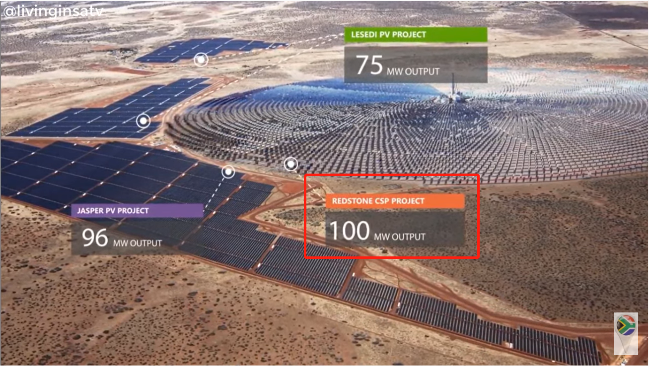 该项目是非洲首个塔式熔盐光热发电项目,位于南非北开普省Kimberley附近的Postmasburg,紧邻SolarReserve和其合作方已开发的75MW的Lesedi光伏电站和96MW的Jasper光伏电站。当地太阳能辐射值2707kWh/平米/年。这三个电站组成了一个光伏和光热发电综合体,总装机达到271MW。