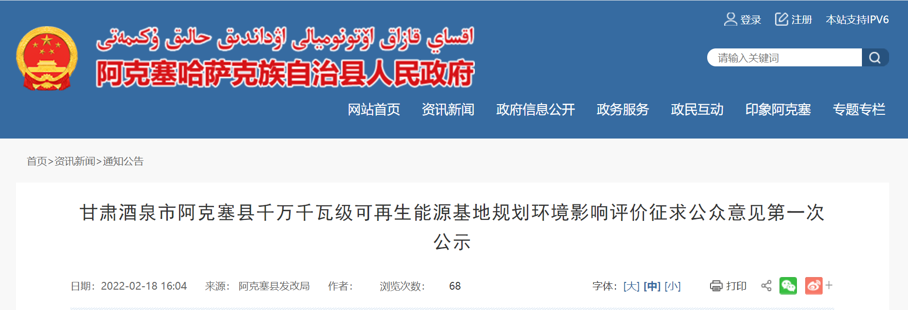 近日,甘肃酒泉市阿克塞哈萨克族自治县人民政府发布《甘肃酒泉市阿克塞县千万千瓦级可再生能源基地规划环境影响评价征求公众意见第一次公示》。