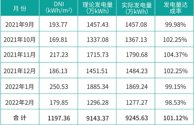 半年度DNI总量为1197.36kWh/平方米,理论发电量9143.37万kWh,实际发电量达9245.63万kWh,平均发电量达成率达101.12%,同时刷新了投运以来半年度发电量与发电量达成率的最高纪录,半年的发电量更是达到了全年设计发电量(1.46亿kWh)的63.3%。