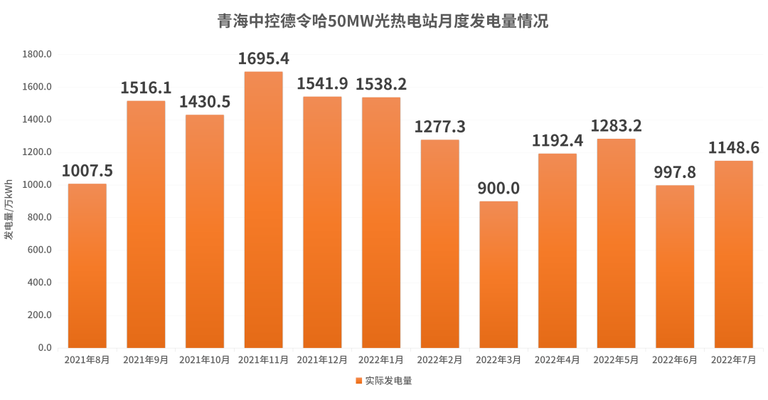 青海中控德令哈50MW光热电站运行数据如约而至,自2021年8月6日(汽轮机完成整改后)至2022年8月5日,电站完整年度累计实际发电量1.58亿kWh,达到年度设计发电量(1.46亿kWh)的108%,创下全球同类型电站最高运行纪录。