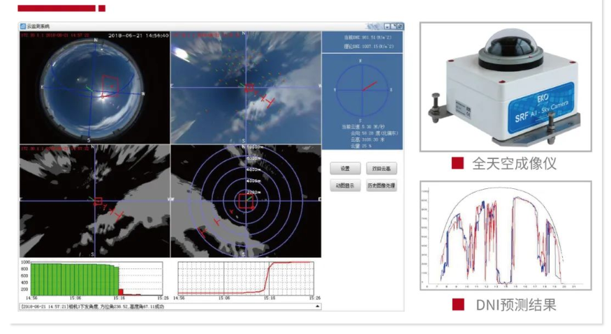 国内首创的云预测系统,具备云识别和运动跟踪功能,实现了30分钟以内的DNI预测功能。