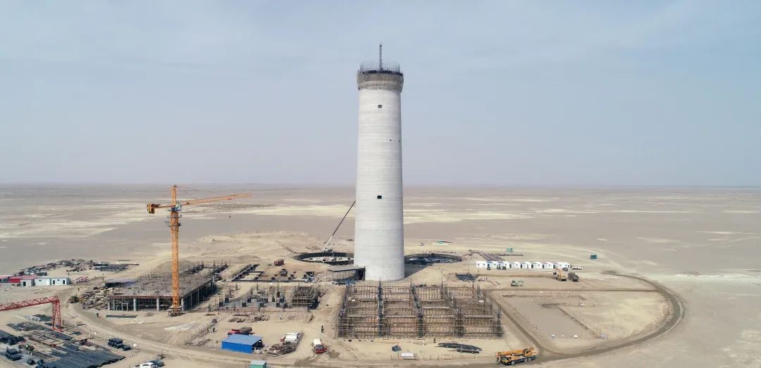 该项目吸热器中心标高220米,混凝土塔高195米。吸热塔于2022年6月17日开始基础混凝土浇筑,克服当地疫情及工程现场沙尘暴、大风等恶劣天气的不利影响,经过累计93天的施工,于9月17日达到100.5米,并计划于今年11月份完成吸热塔封顶。