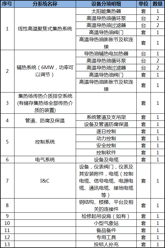 其中,槽式光热辅热模块具体招标内容包括:1套满足本工程使用的槽式光热集热系统及其辅助设备,并完成整套系统装备及辅助设备的制造与现场组装。