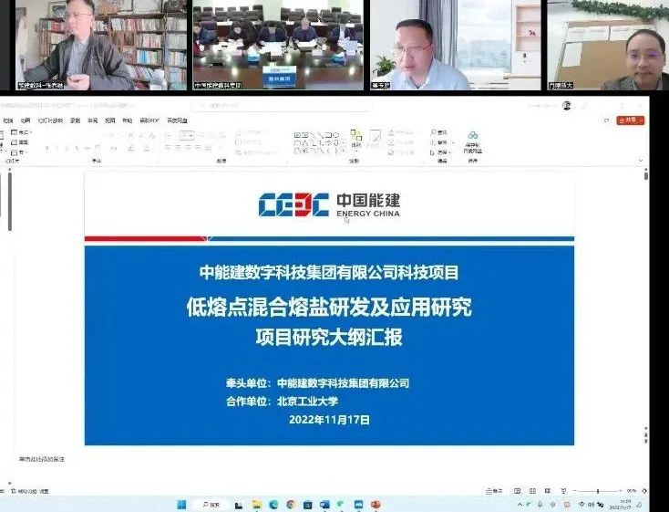 11月17日,中能建数字科技集团有限公司科技项目“低熔点混合熔盐研发及应用研究”研究大纲评审会召开。该项目由中能建数字科技集团有限公司牵头,北京工业大学作为合作单位。