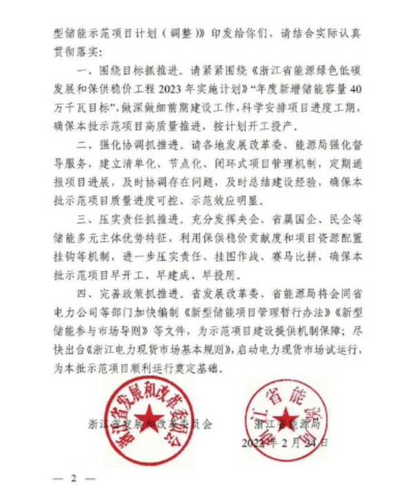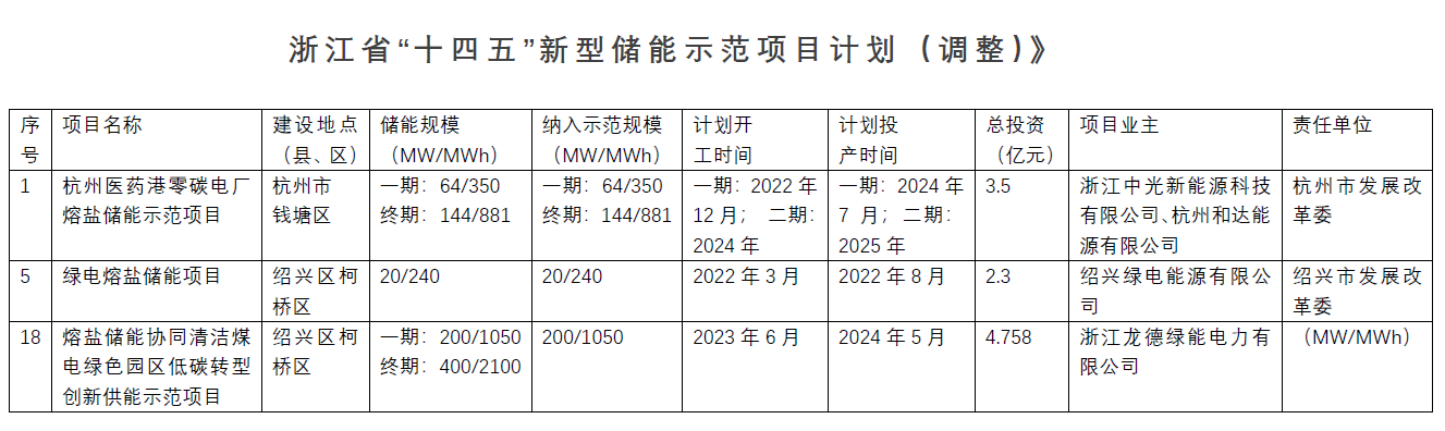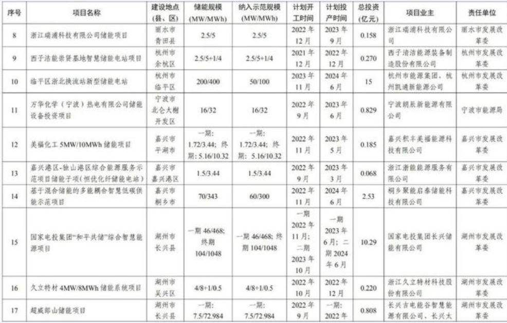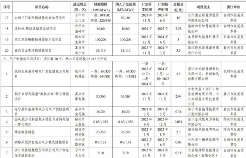 《浙江省“十四五”新型储能示范项目计划(调整)》是在2022年5月发布的《浙江省“十四五”第一批新型储能示范项目》基础上,紧密结合当前浙江省能源绿色低碳发展和保供稳价形势,为加快推进新型储能示范项目建设,对第一批示范项目进行优化调整,明确了项目开工、投产时间节点,建立清单化、节点化、闭环式项目管理机制,进一步压实主体责任,确保示范项目早开工、早建成、早投用。