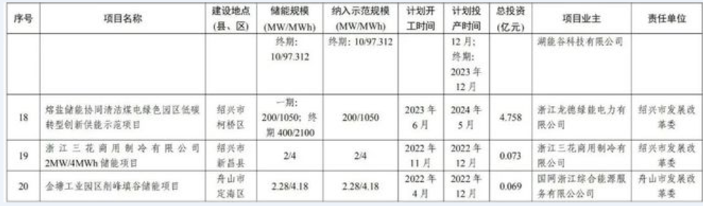 其中,3个熔盐储能相关项目总投资达10.558亿。浙江中光新能源科技有限公司、杭州和达能源有限公司总投资为3.5亿的杭州医药港零碳电厂熔盐储能示范项目一期计划于2024年7月投产,二期计划于2025年投产;浙江龙德绿能电力有限公司总投资为4.758亿的熔盐储能协同清洁煤电绿色园区低碳转型创新供能示范项目计划于2023年6月开工,2024年5月投产;绍兴绿电能源有限公司总投资为2.3亿的绿电熔盐储能项目目前已投运。