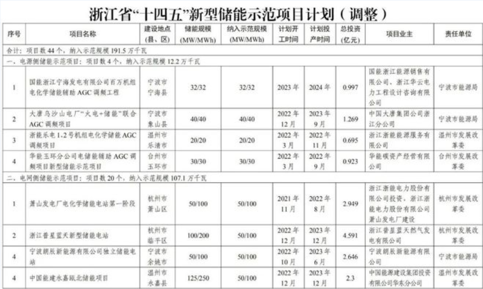 近日,浙江省发改委、能源局印发《浙江省“十四五”新型储能示范项目计划(调整)》的通知,共44个新型储能示范项目,纳入示范规模共191.5万千瓦。