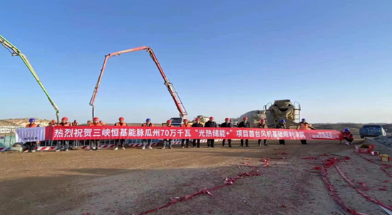 3月30日上午8时,伴随着清脆的鞭炮声,国家光热联盟理事单位——三峡恒基能脉瓜州70万千瓦“光热储能+”项目风电工程首台风机基础顺利完成浇筑。首台风机基础的浇筑,标志着风光热一体化项目的40万千瓦大型风电场工程基础施工作业正式拉开序幕,为今年年底完成风电场建成投产提供了有力保障。