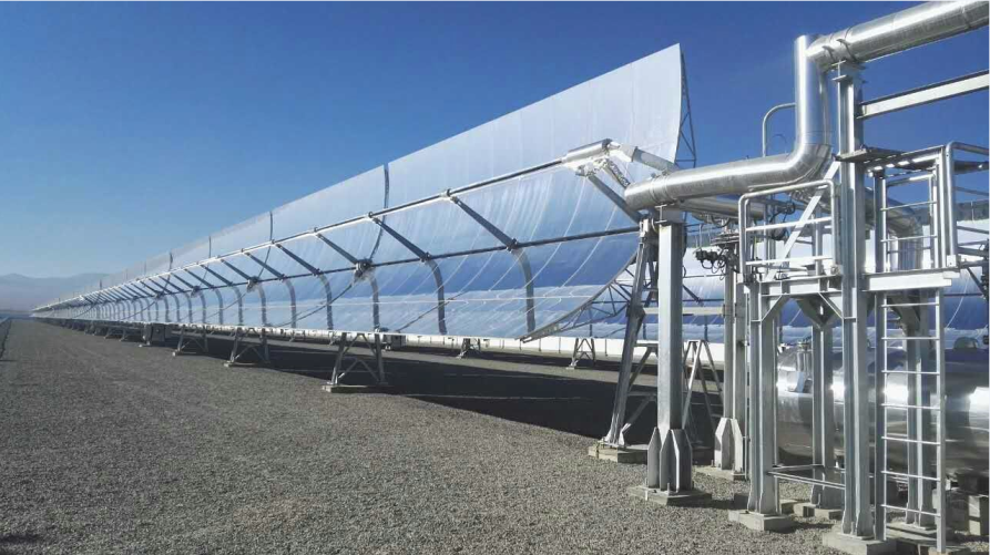 集热岛采用二元熔盐槽式聚光发电技术路线,电站总集热面积为82.56万平米。储热岛传热储热介质采用二元熔盐(60%硝酸钠与40%硝酸钾),共设置1组熔盐储罐,包括一个冷熔盐罐和一个热熔盐罐,总储热容量约为3255.4MWh,储热时长约16小时。熔盐的工作温度为290℃~520℃。