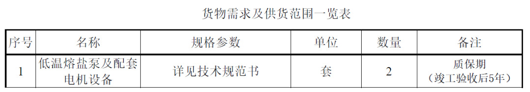 2套光热低温熔盐泵及配套电机设备及其所有附属设备和附件,包括设备及供货范围内所有设备及元器件的选择、设计、制造、试验(包括型式试验、出厂试验、交接试验)、供货、包装、运输、现场交接;提供指导安装和调试、现场技术培训;指导现场试验和验收、参加试运行和协助交接验收;负责产品资料文件编制和提交等,详见下表。
