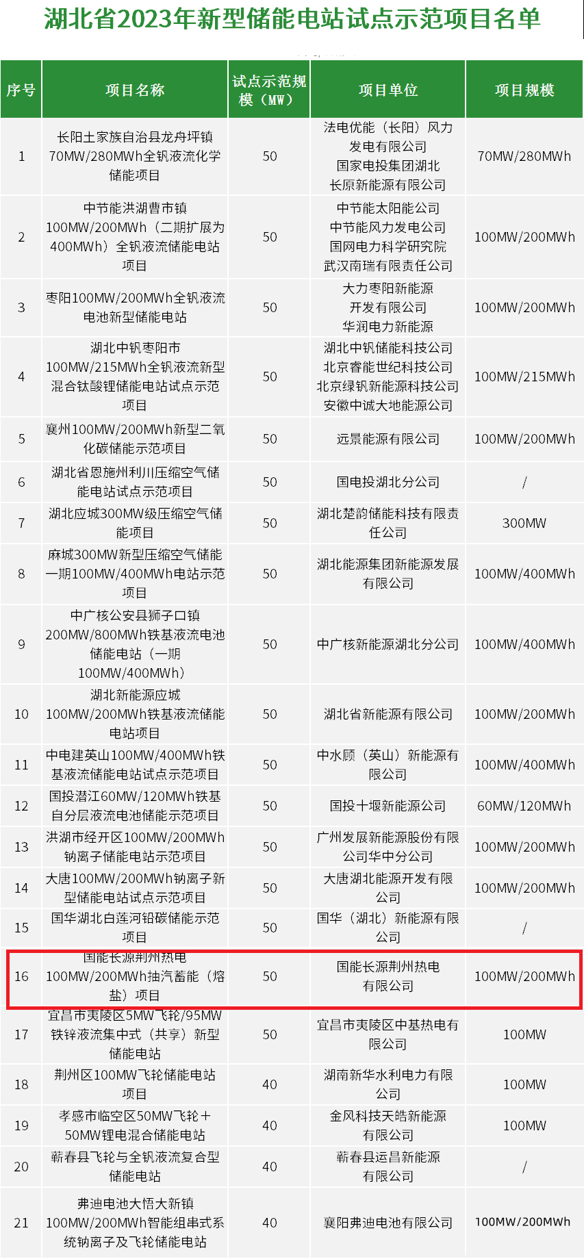 近日,国家能源集团湖北公司——国能长源荆州热电有限公司100MW/200MWh抽汽储能(熔盐)项目通过公示期,正式被纳入湖北省2023年新型储能电站试点示范项目,并获得核准批复。