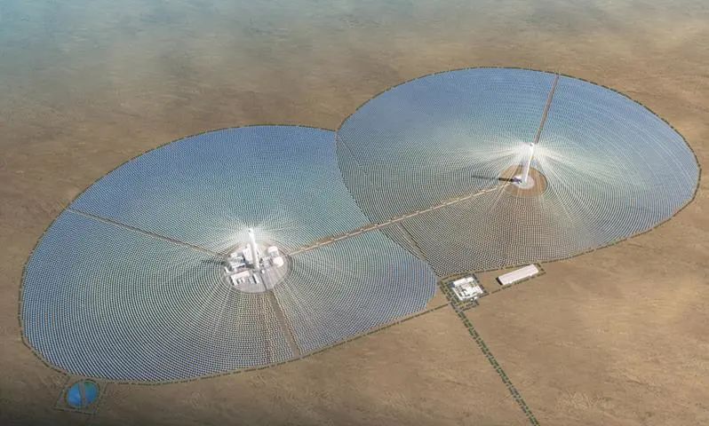 据介绍,由恒基能脉设计的“两塔一机”方案是:在光热电站设置两个相邻的吸热塔,两个吸热塔上的吸热器各自吸收定日镜反射的太阳光,并将吸热器内的介质加热至设计温度,继而利用高温介质直接(或间接)通过热力循环推动一台发电机发电。