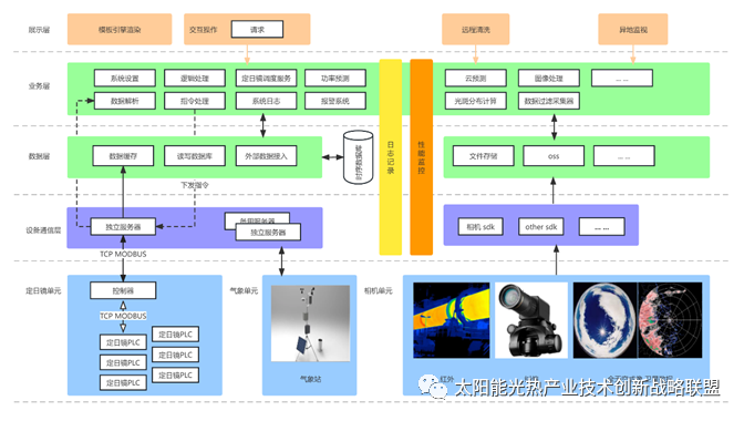 其中,基础硬件单元层,包含定日镜单元、红外系统、纠偏系统、云预测系统、光功率预测系统等多个模块,可实现聚光场一键启停,能流密度自动调整,系统运行模式自动切换等功能。