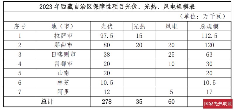 2023年5月18日,西藏自治区发改委印发《2023年光伏、风电发电等新能源开发建设方案》,2023年全区新增新能源装机规模573.5万千瓦。其中,保障性并网项目建设规模373万千瓦,含光热35万千瓦,由各地(市)能源主管部门按照年度建设规模组织开展竞争性配置;市场化并网项目建设规模200.5万千瓦,由自治区能源主管部门滚动纳入项目库,由地(市)能源主管部门按照《西藏自治区企业投资项目核准和备案管理办法》组织实施。