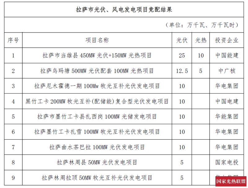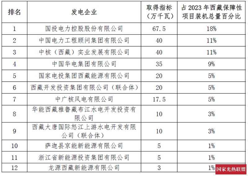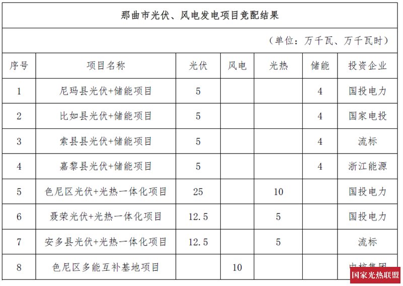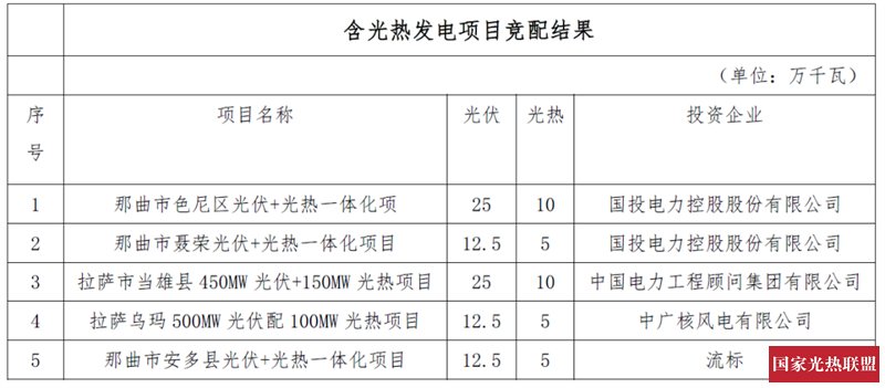在35万千瓦光热发电装机保障性指标中,国投电力获得15万千瓦,中国能建10万千瓦,中广核5万千瓦。那曲县含5万千瓦光热发电项目流标,现已发布第二次竞标磋商公告,详情可见:2024年10月建成,那曲5万千瓦光热项目竞争性配置(二次)磋商公告