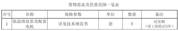 低温熔盐泵及配套电机本次采购将由成交人承包提供3套光热低温熔盐泵及配套电机及其所有附属设备和附件,包括设备及供货范围内所有设备及元器件的选择、设计、制造、试验(包括型式试验、出厂试验、交接试验)、供货、包装、运输、现场交接;提供指导安装和调试、现场技术培训;指导现场试验和验收、参加试运行和协助交接验收;负责产品资料文件编制和提交等,详见下表。