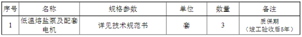 低温熔盐泵及配套电机本次采购将由成交人承包提供3套光热低温熔盐泵及配套电机及其所有附属设备和附件,包括设备及供货范围内所有设备及元器件的选择、设计、制造、试验(包括型式试验、出厂试验、交接试验)、供货、包装、运输、现场交接;提供指导安装和调试、现场技术培训;指导现场试验和验收、参加试运行和协助交接验收;负责产品资料文件编制和提交等,详见下表。
