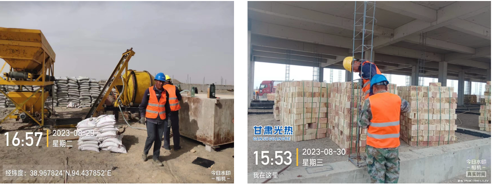 图:土建工程(左:主厂房钢筋除锈 右:拌合站维修完毕具备生产条件)