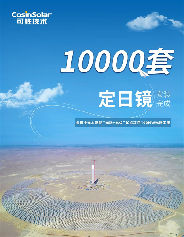 据国家光热联盟理事单位——浙江可胜技术股份有限公司消息,9月8日,金塔中光太阳能“光热+光伏”试点项目10万千瓦光热工程顺利完成第10000套定日镜安装,3.62平方公里的巨大定日镜场在戈壁上已现雏形。