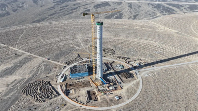 该项目负责人表示,西侧吸热塔的封顶标志着全球首个“双塔一机”塔式光热发电项目取得了突破性进展,为后续的施工奠定了坚实的基础。与此同时,东侧吸热塔已经施工至154.5米,核心发电区主厂房一层结构完成80%,低温熔盐罐制作安装完成14%,高温熔盐罐制作安装完成7%,镜场浇筑预制管桩共计12910根,完成48%。