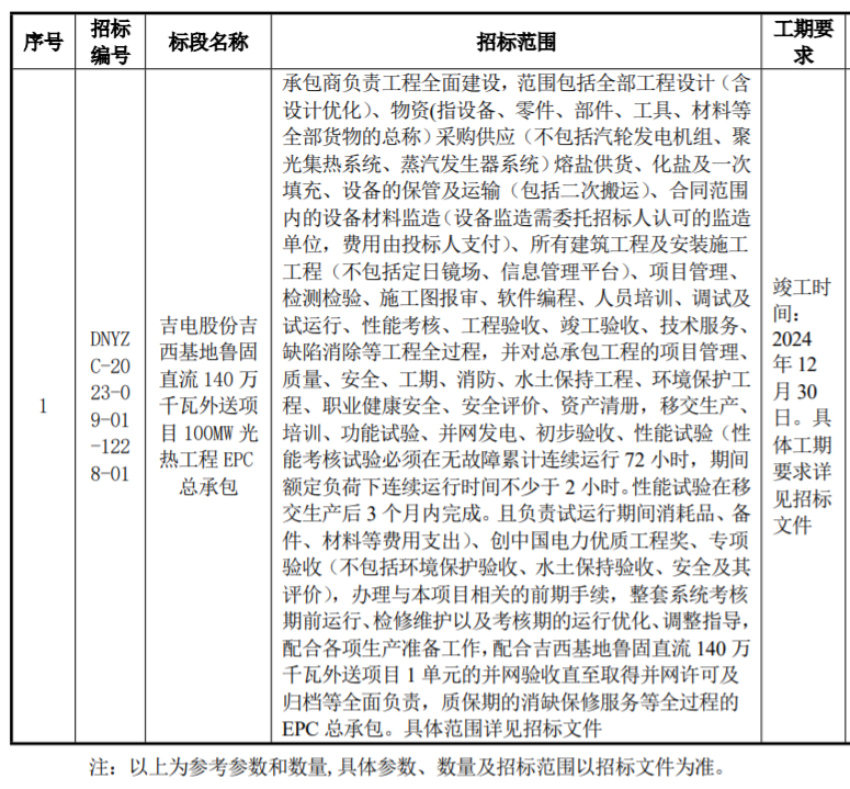9月28日,中国电能成套设备有限公司受国家电力投资集团有限公司委托,就吉西基地鲁固直流140万千瓦外送项目 1 (光热100MW) EPC总承包项目进行公开招标
