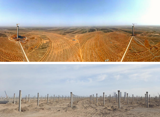 据国家光热联盟理事单位——甘肃省安装建设集团有限公司(简称:甘肃安装集团)消息,目前由其与中国葛洲坝集团电力有限责任公司(联合体牵头)、恒基能脉新能源科技有限公司作为联合体总承包建设的三峡恒基能脉瓜州70万千瓦“光热储能+”光热发电定日镜场栽桩数量已完成过半。