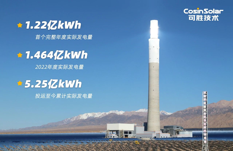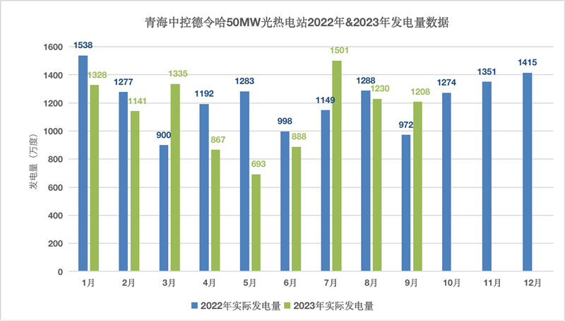 青海中控德令哈50MW光热电站自2018年12月30日并网发电后,2019年上半年快速完成了试运行与消缺,2019年7月开始移交生产运行。电站移交生产后的首个完整年度,累计实际发电量1.22亿kWh;2022年度,累计实际发电量1.464亿kWh,发电量达到年度设计发电量的100.26%;投运至今,电站累计实际发电量5.25亿kWh。