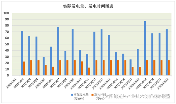 项目投运2年多以来,在中电哈密太阳能热发电有限公司统一协调下,各参建单位齐心协力,不断摸索高风速区域光热电站运行维护经验。2023年9月底完成了储换热系统、发电岛系统设备的检修与维护,10月初再次投入运行。截至到10月22日,本月机组已连续运行21天,当月发电量超过1170万千瓦时,创下机组投运以来单月发电量新高;其中10月19日发电量86.9万千瓦时,创下单日发电量新高。