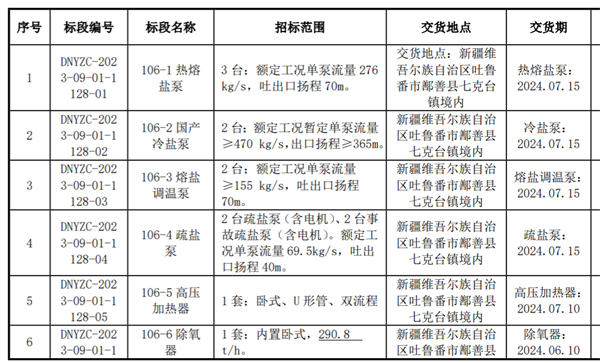 其中,上海凯泉泵业(集团)有限公司中标热熔盐泵;济南华威泵业有限公司中标熔盐调温泵;江苏金麟化工机械有限公司中标疏盐泵。