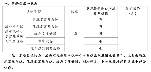 根据竞争性磋商文件,中标人将为“液态空气储能中试平台水蓄热系统及附属设备”项目提供高压水蓄热系统、低压水蓄热系统、液态空气储罐、制冷设备、电加热器辅助设备。